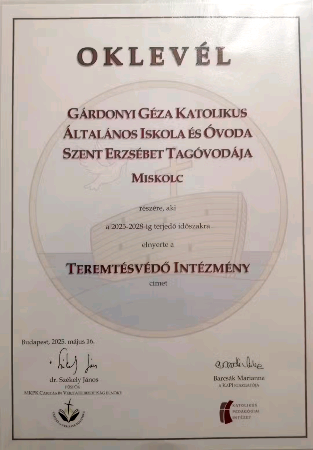 Munkatársi közösségünk örömmel fogadta a hírt, hogy a Katolikus Pedagógiai Intézet által kiírt pályázaton óvodánk 4 évre elnyerte a TEREMTÉSVÉDŐ ÓVODA címet. 🙏